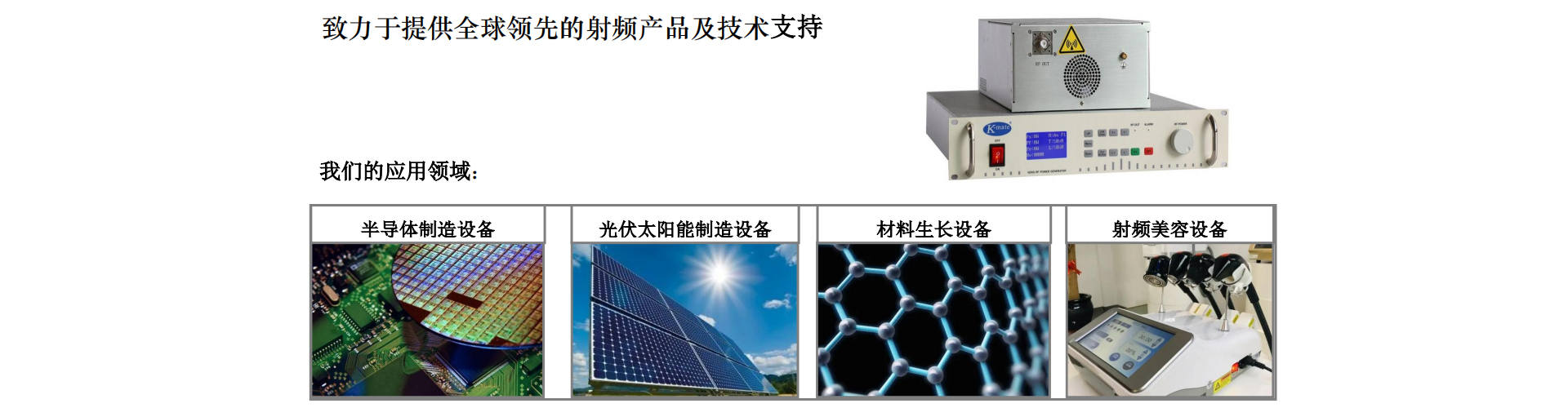 中山市酷美電子有限公司是一家專業(yè)從事半導體制造設備研發(fā)、設計和制造的高科技合資企業(yè)。產品主要有射頻電源、射頻自動匹配器、射頻功率分配器,廣泛用于太陽能光伏系統(tǒng)、PECVD、真空鍍鏌、刻蝕等真空設備當中。公司于2000年進入半導體領域,已有20多年豐富的行業(yè)經驗。